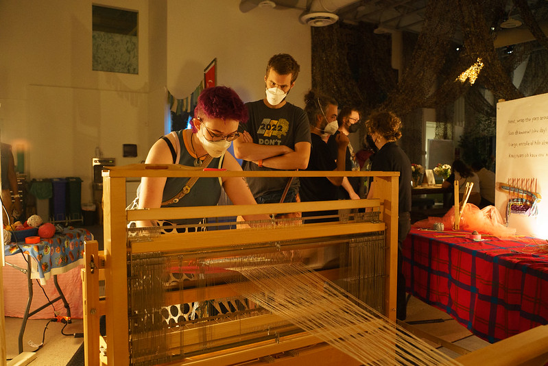 Community Cloth is an interactive artwork that asks participants to share stories about cloth while helping to create a woven tapestry. Over the course of the festival, visitors will have the chance to explore an array of materials and contribute to a growing piece of fabric, finding connection in the process. Just as weaving transforms many threads into cloth, conversation and sharing interlaces individuals into a community. Community Cloth is a space for empathy, where strangers can connect over ribbons from last year’s gifts, hems of cropped tee shirts, scraps of precious silks, mismatched shoelaces, long-forgotten stashes of yarn, and so much more. After exploring the menagerie of materials, take a spot in front of a loom and weave a section of cloth, sharing a memory made physical. Come weave with us, and find connection to cloth and community in the process.