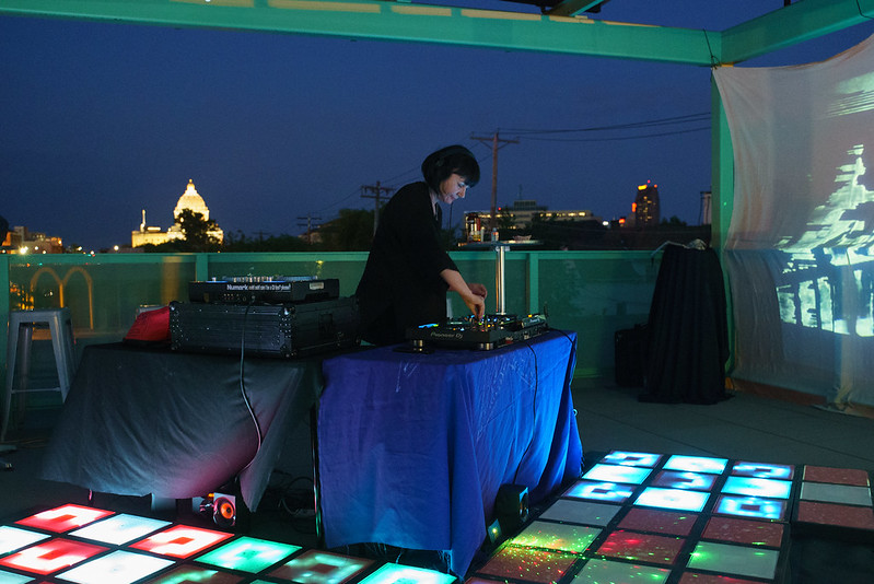 Outside Springboard for the Arts, glowing lights emanate from the rooftop and a dull pulsing beat is felt in the distance. As audience goers roam the building, a red velvet rope is present near the elevator. An ominous figure guides you in and escorts you to your precarious location. As the mysterious elevator doors open to the rooftop, the audience is then immersed in an audio/visual experience that emulates an exclusive vampire club showcased in various movies. The dance floor where guests gather will light up and encourage your movement across the space; the projected images will inspire macabre thoughts as the ambient music from bass-driven dark dance and intense gothic rock create a cathartic experience to shake off the stresses of a thousand days.