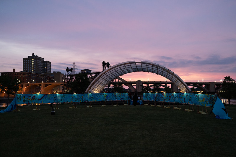 The notion that water is integral to life is prevalent in almost every indigenous culture and community. Dakhóta peoples have a saying: Mni Wiconi (water is life) and Anishinaabe peoples have the same phrase in their language: Bimaadiziwin Nibi. For Indigenous peoples water is an ancestor, water is a teacher, water is a guide, and water is life. This project is a large-scale installation of two cloth rivers that span what is now Raspberry Island in Imnížaska Othúŋwe/Ashkibagi-ziibiing (St. Paul). The cloth rivers are replicas of Ȟaȟáwakpa/Gichi-ziibi (Mississippi River) and Mnísota Wakpá/Ashkibagi-ziibi (Minnesota River).