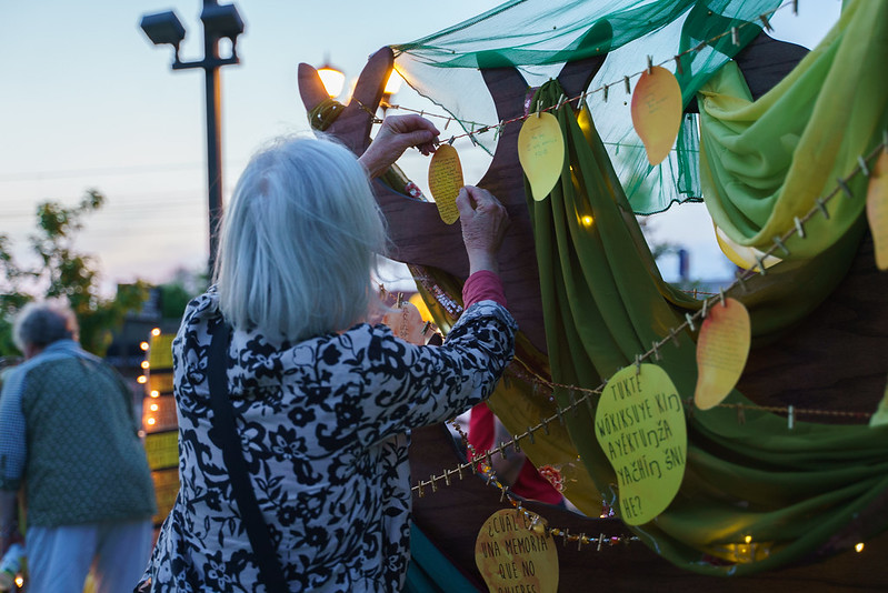 Anyone who’s ever bitten into a fresh, ripe mango cannot forget the experience. The fruit evokes memories not only of smell and taste, but sensations of warmth, abundance, and home — especially for those who come from places where mangoes grow abundantly. Using the fruit to connect the past and the future, Mangos Are Memories invites audiences to think about their memories, asking: What memories do you come from? What memories do you want to pass on? How do you want to be remembered? This project centers a mango tree with a canopy made of saris. Like mangos, textiles evoke memories — the intimacies of clothing and feeding ourselves are intricately connected. By using traditional and contemporary saris, the artist welcomes her own ancestors into the space, and creates an environment for audiences to welcome theirs. Audiences are invited to share their memories — writing them on paper mangos to add to the tree, or speaking them into a recorded soundscape that will play throughout the night. The accumulation of memories will offer reflection on where we come from and what we want to leave behind, both as individuals and as communities.