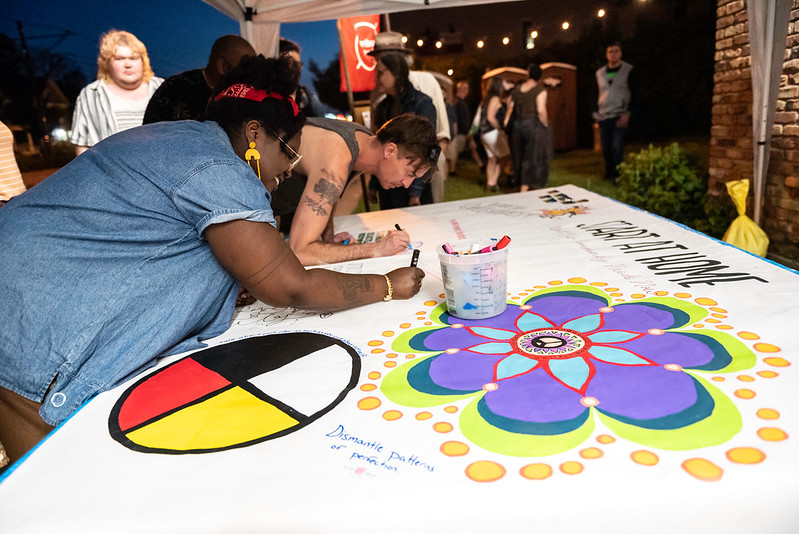 How can we change the world if we don’t start in our own communities? We need to scale that back and start with immediate community needs. Let’s share space with one another and paint positive change together during this collaborative banner design. This painted banner will hold conversations around joy, healing, solutions, and connectivity within ourselves and one another. Our community needs healing, happiness, and connections!